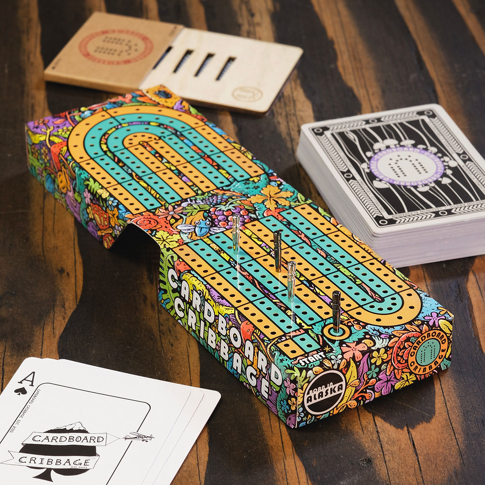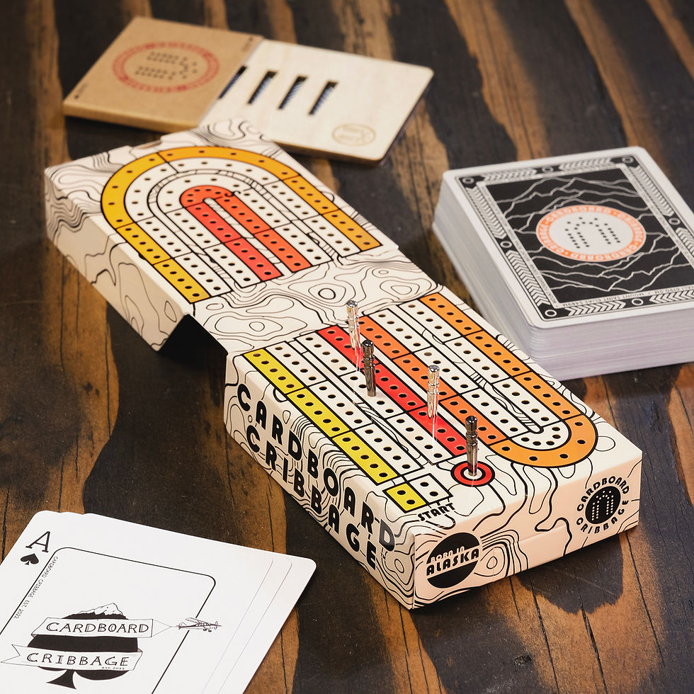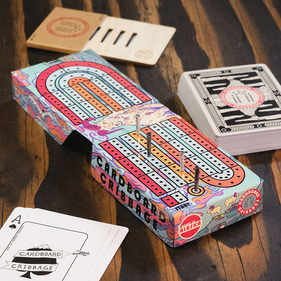 Discover our unique travel cribbage sets where your card box IS the board. These ultralight and durable boards are made in Alaska and include original art, making them the perfect game for any journey.