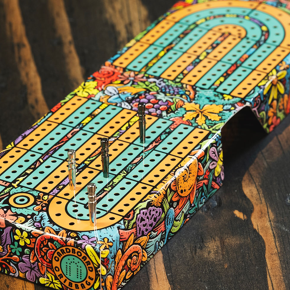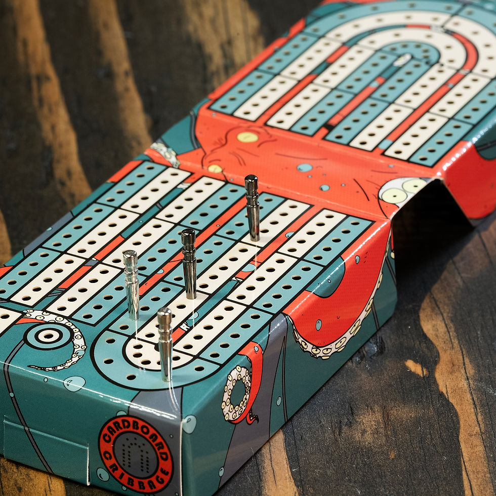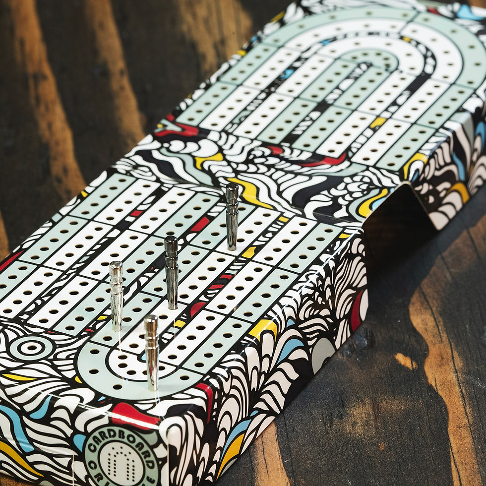 Made with a thick, durable, UV treated card stock, every Cardboard Cribbage set is ready to go anywhere a box of cards can. Simply unfold the box in one motion and voila! you have a cribbage board. A nifty wooden card-shaped compartment inside the box keeps the metal pegs safe and secure.